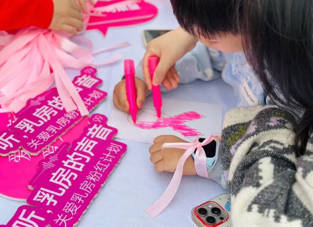 共绘粉红丝带打卡点,每人执一支粉色彩笔,共同在一张纸上描绘一条粉红丝带。一笔一画,爱意流转在笔尖和纸上,用色彩诠释"关爱从携手开始"。